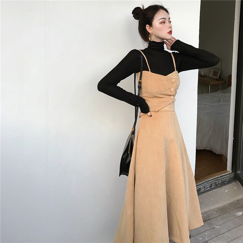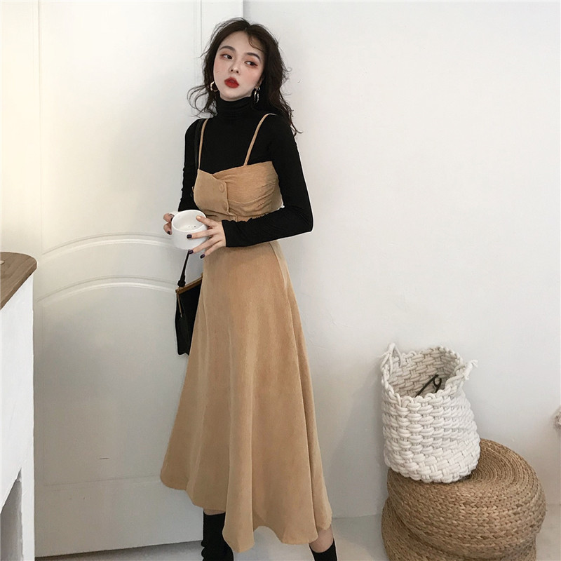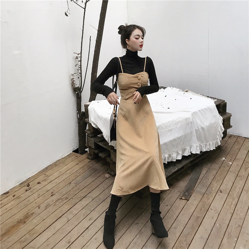 / 韓版修身復古中長款收腰燈芯絨吊帶連衣裙+黑色百搭高領打底衫潮