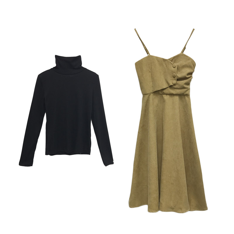 韓版修身復古中長款收腰燈芯絨吊帶連衣裙+黑色百搭高領打底衫潮