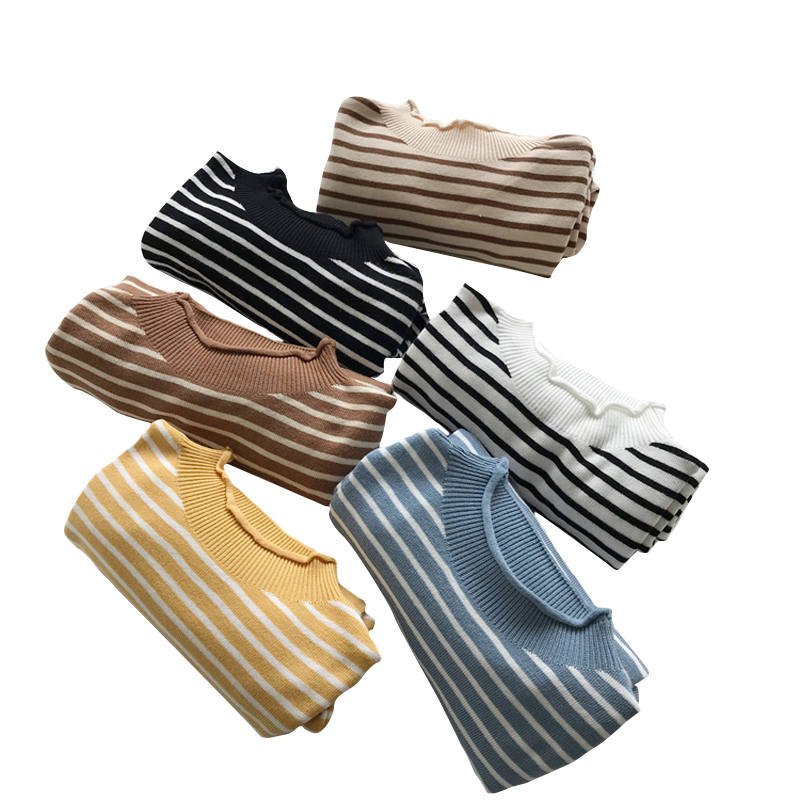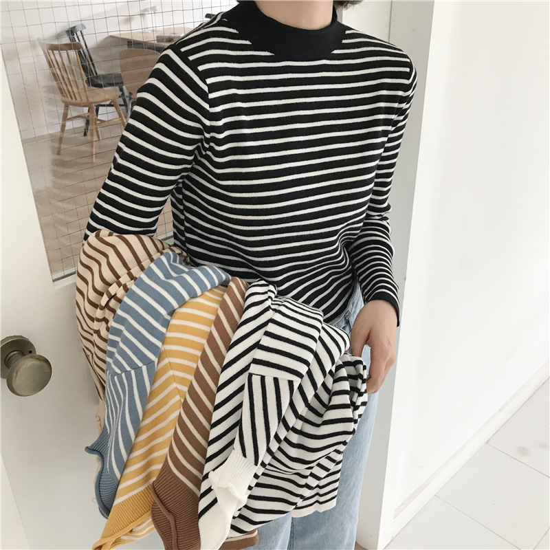 秋冬韓版學院風條紋修身顯瘦網紅套頭長袖針織衫打底衫毛衣上衣女