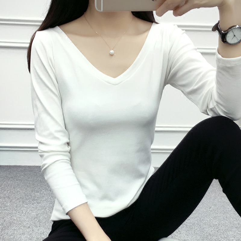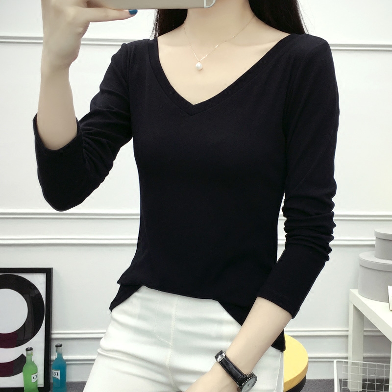 / 秋裝棉v領百搭長袖T恤女打底衫外穿大碼顯瘦女裝上衣潮