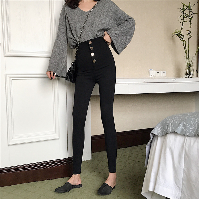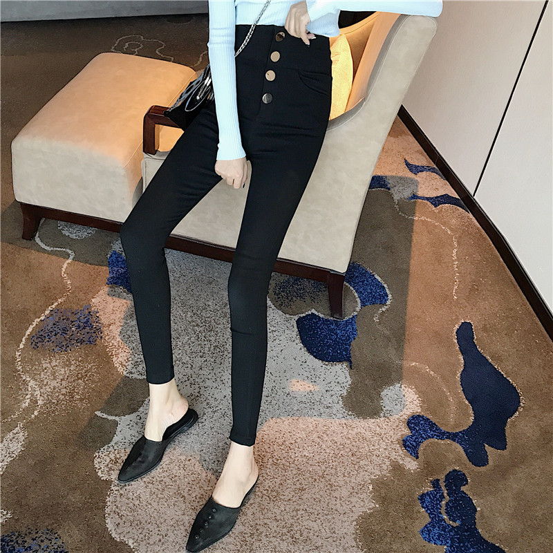 / 韓版女褲秋季2018新款春秋百搭高腰單排扣彈力修身鉛筆小腳休閑褲