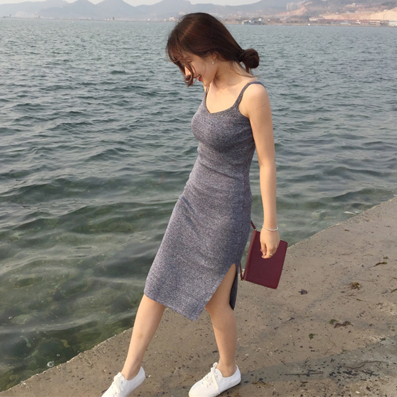 外穿吊帶連衣裙女秋裝2018新款修身顯瘦氣質開叉黑色條紋中長裙子