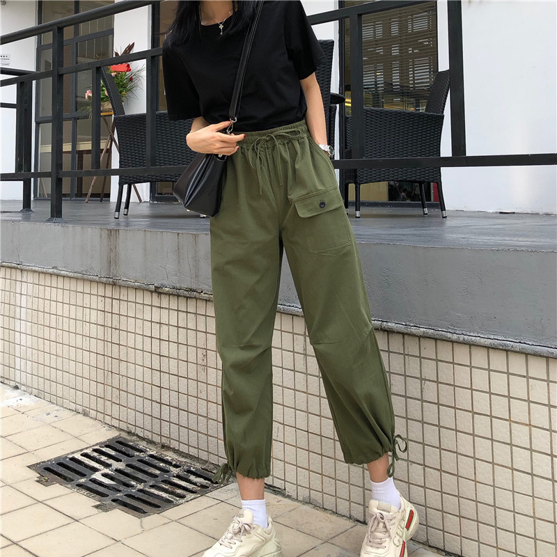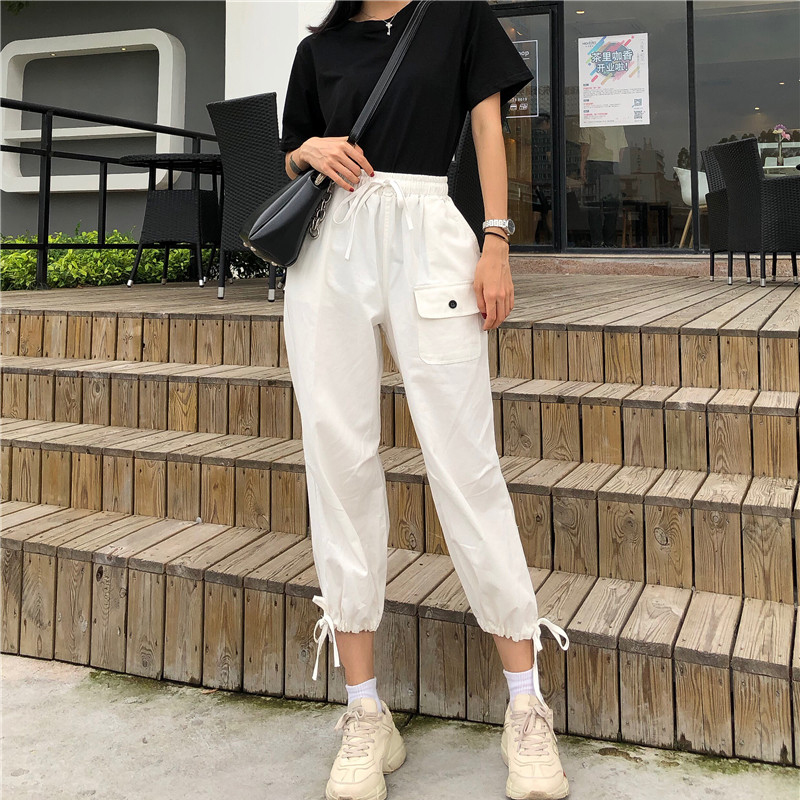 兩件套女夏季新款女裝韓版純色短袖黑T+工裝束腳九分褲闊腿休閑褲