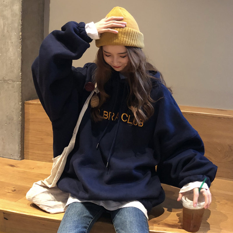 / 秋冬女裝韓版中長款慵懶風字母刺繡寬松連帽加絨加厚衛衣上衣外套