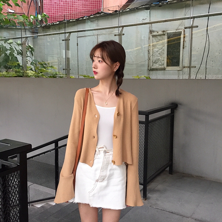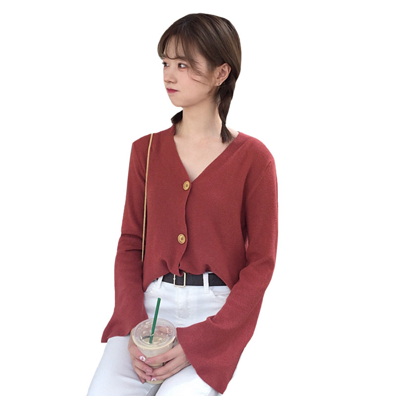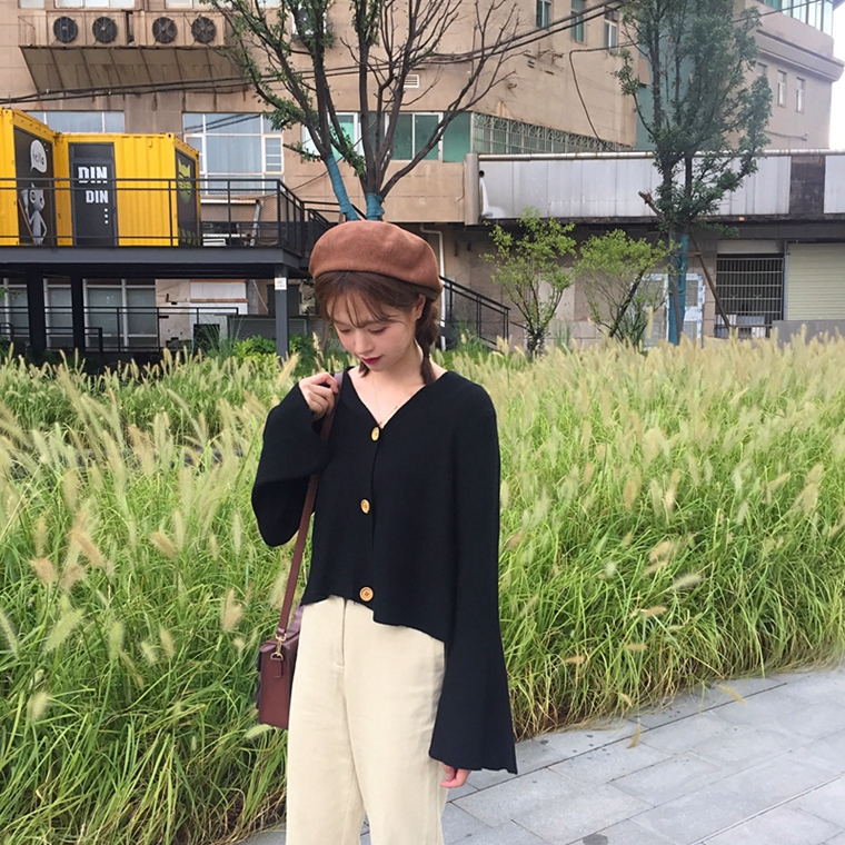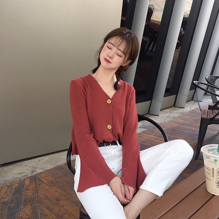 / 秋季女裝韓版短款純色氣質V領喇叭袖毛衣針織衫長袖開衫上衣外套