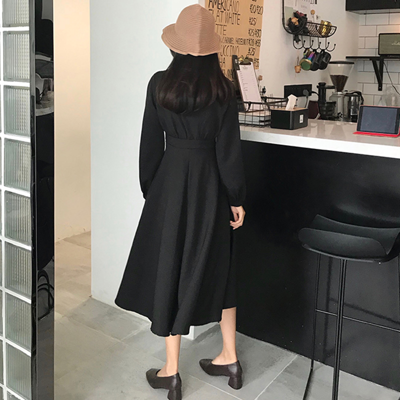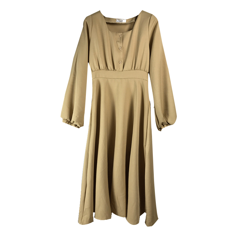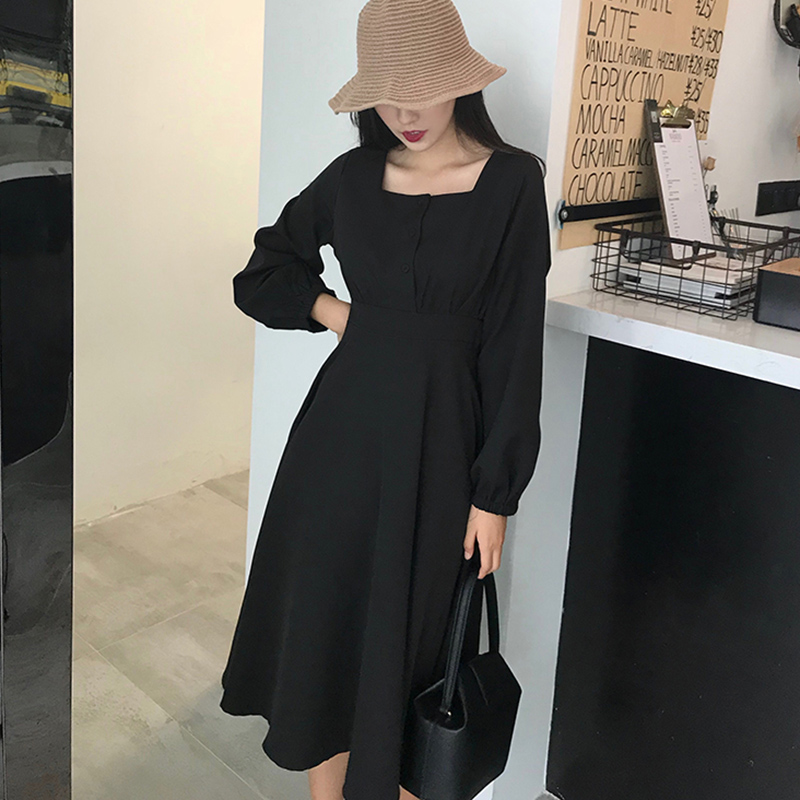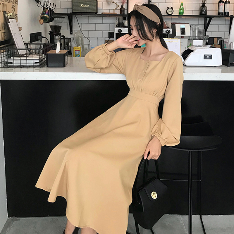 / 女裝復古氣質收腰顯瘦長袖連衣裙女秋新款方領燈籠袖中長A字裙子