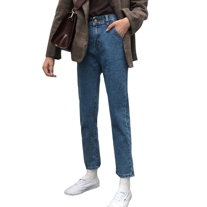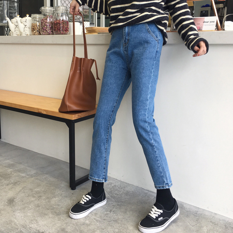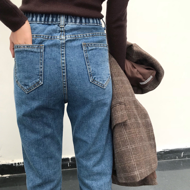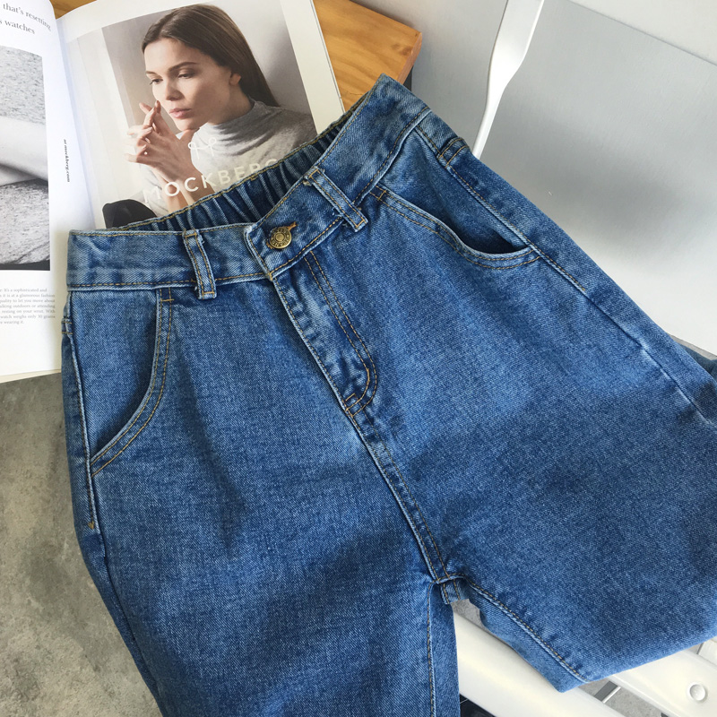 秋季女裝韓版寬松松緊腰牛仔褲學生高腰顯瘦直筒褲九分褲小腳褲潮