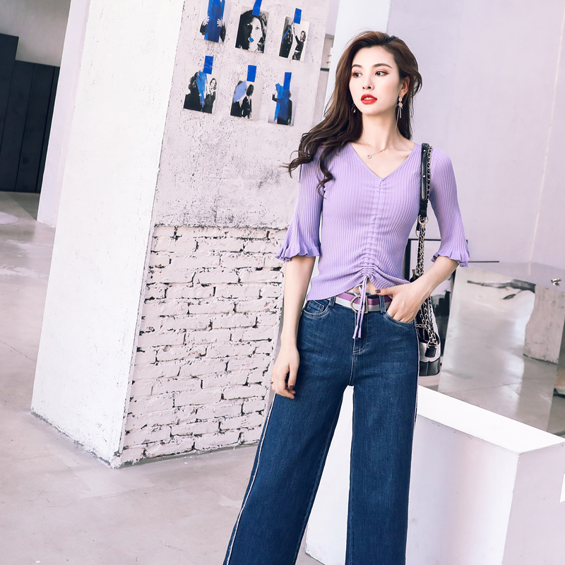 / 牛仔闊腿褲套裝女秋季韓版2018新款時髦女裝針織衫上衣休閑兩件套