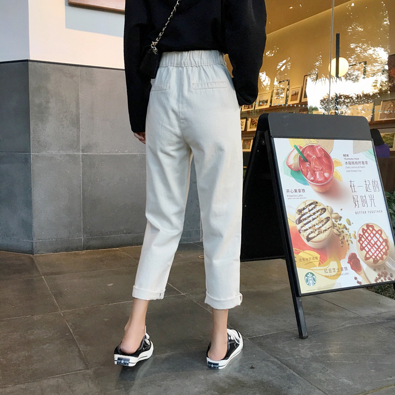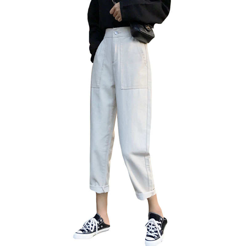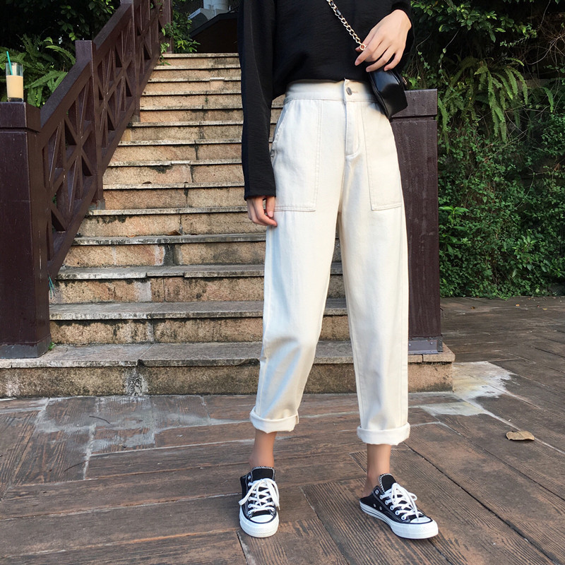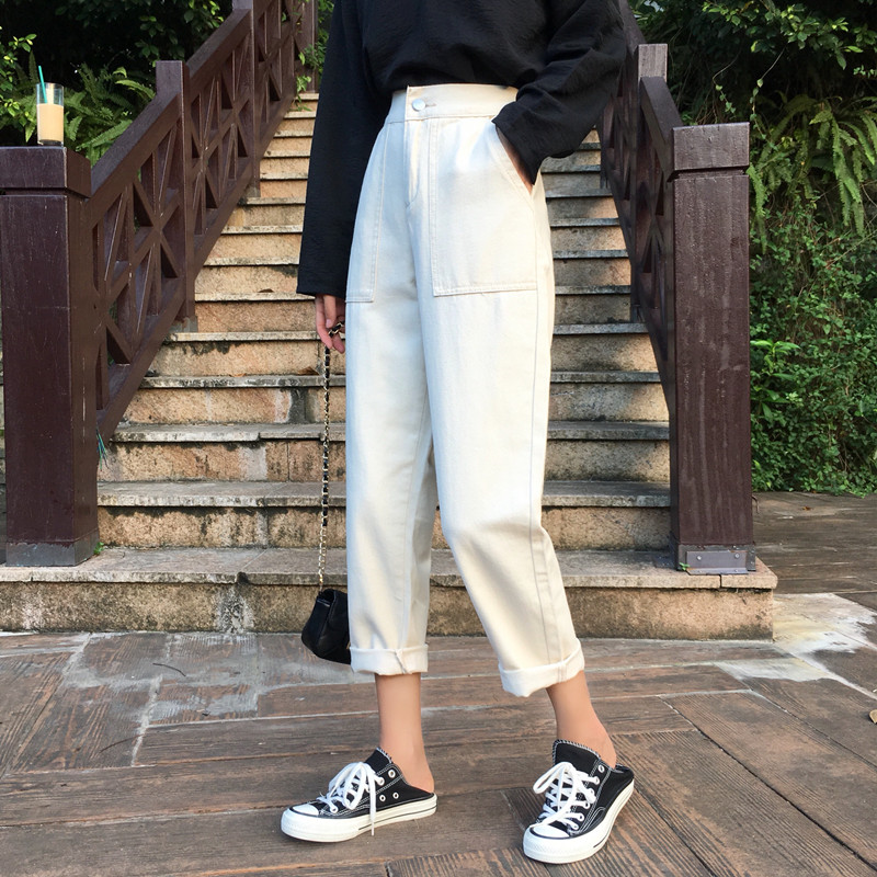 / 秋季女裝韓版簡約寬松大口袋牛仔褲學生褲子高腰闊腿褲直筒褲長褲