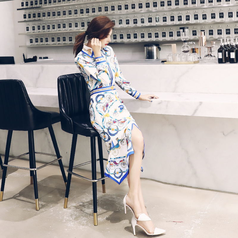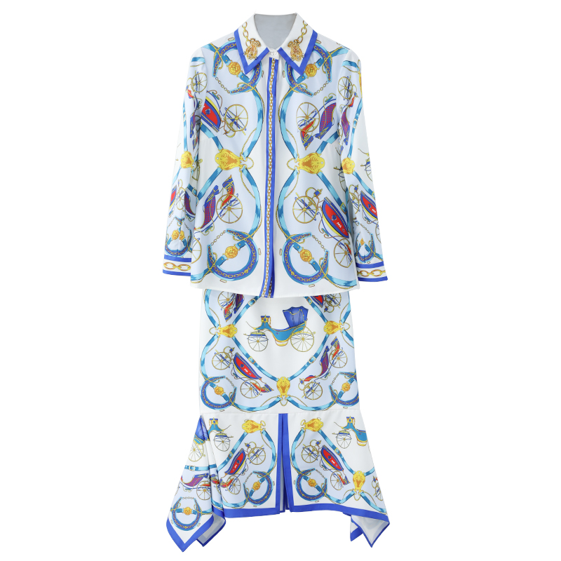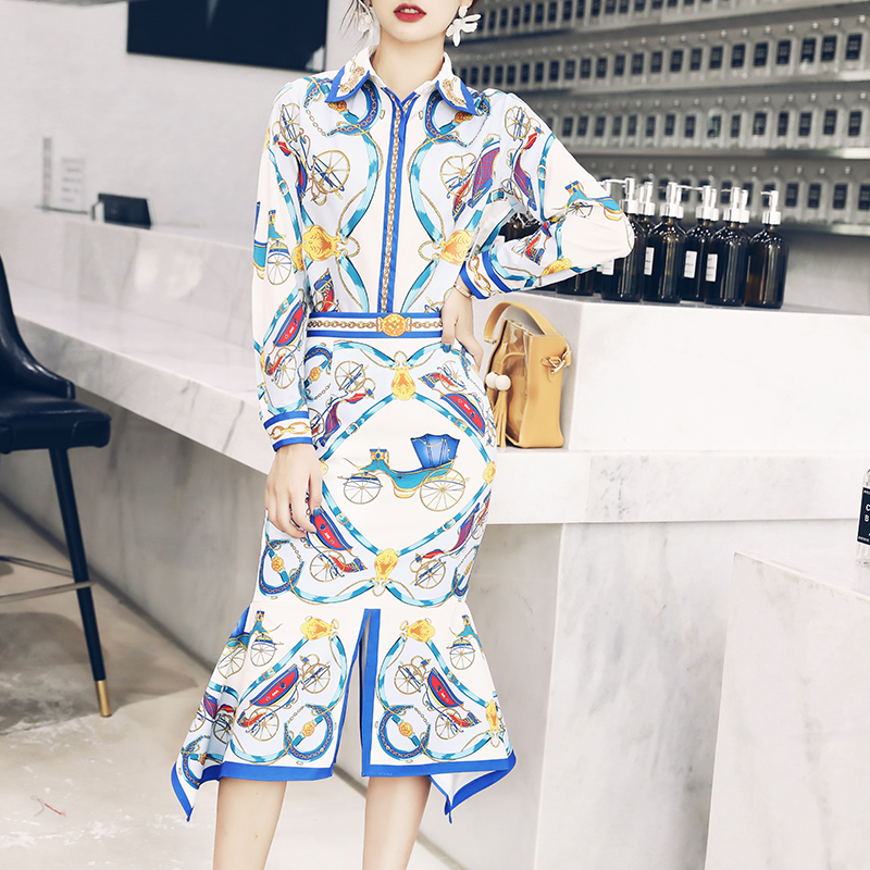 / 名媛2018秋季新品復古印花長袖襯衫顯瘦開叉魚尾半身裙兩件套裝女
