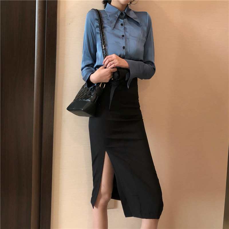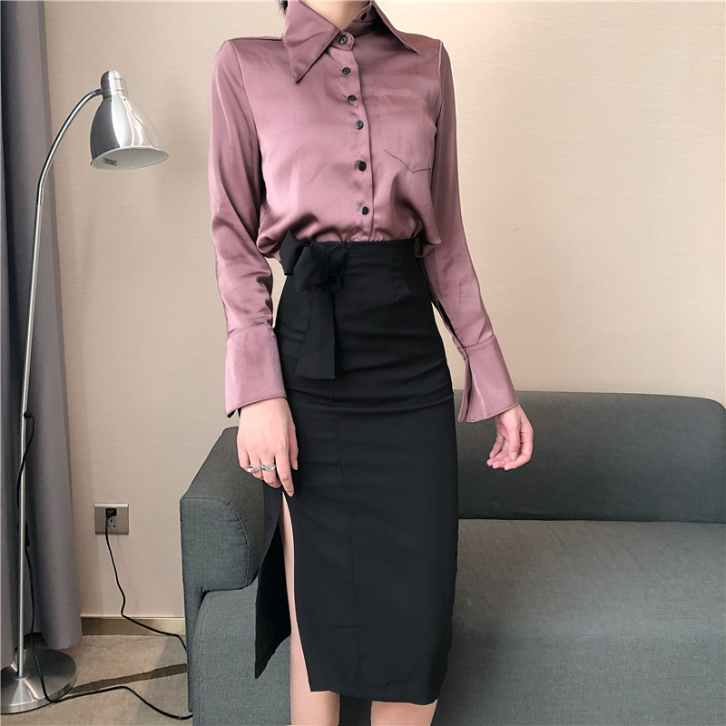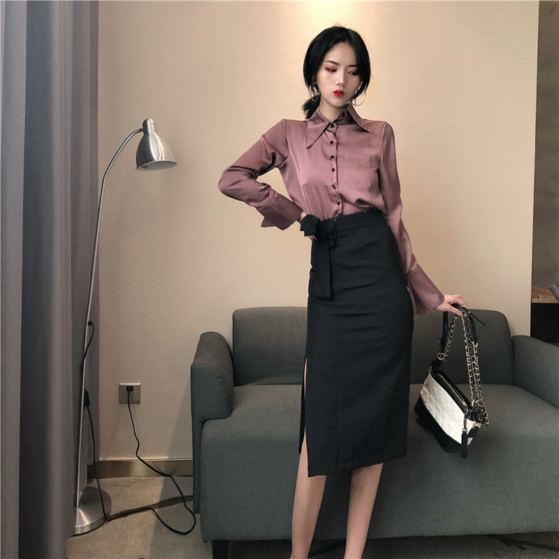 / 2018秋裝新款韓版百搭襯衣長袖高腰蝴蝶結開叉包臀裙套裝兩件套女