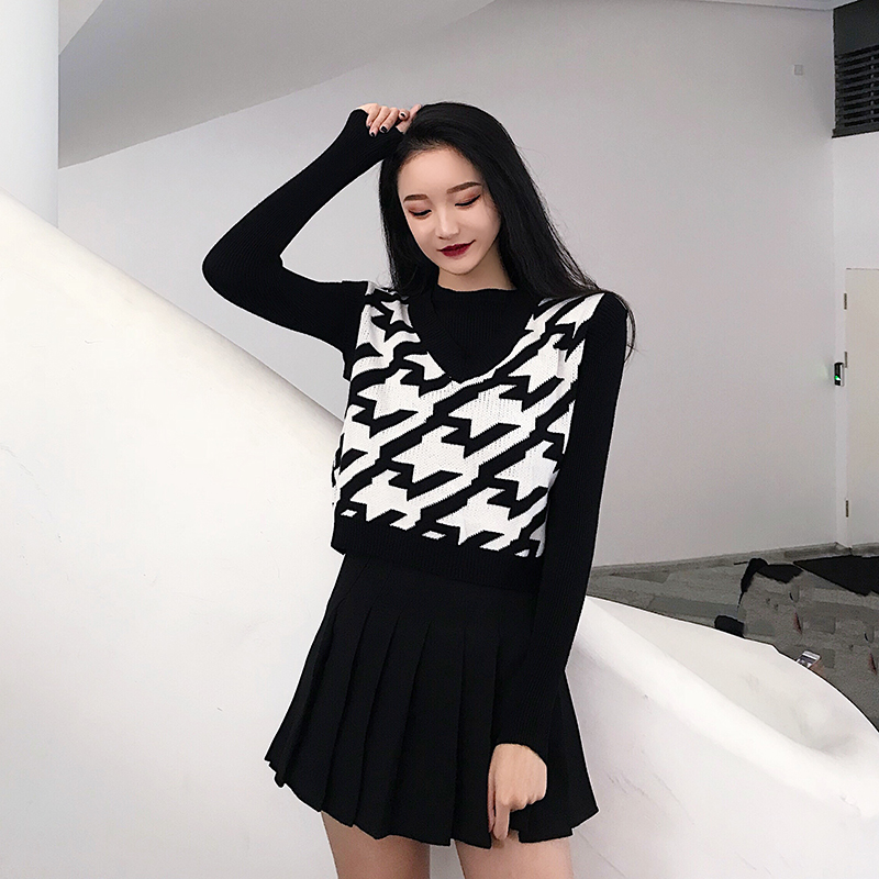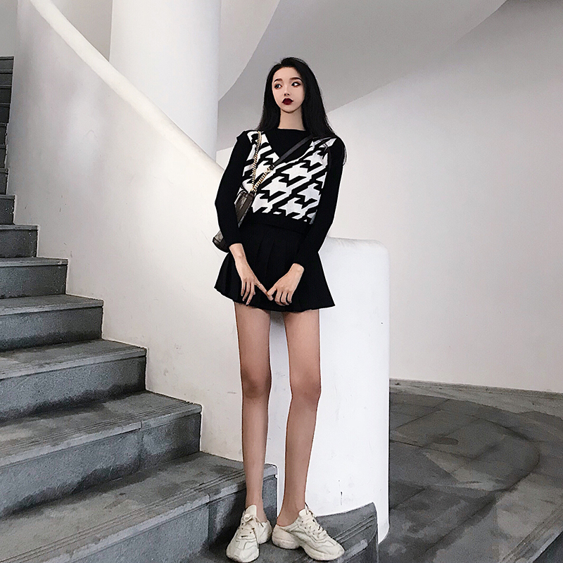 / 韓版時尚百搭寬松馬甲背心+簡約純色針織打底衫+高腰百褶裙三件套