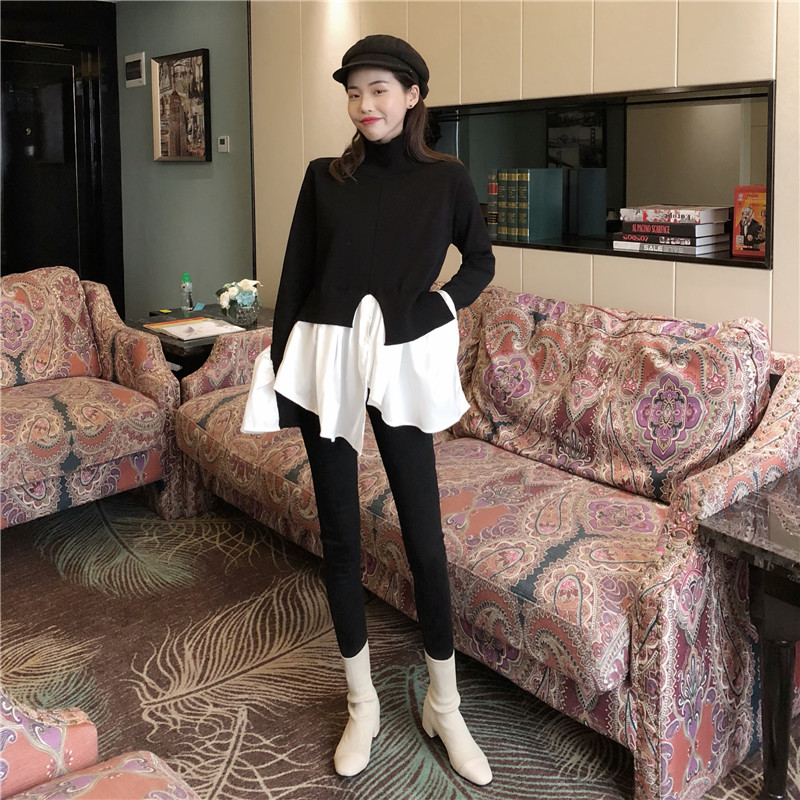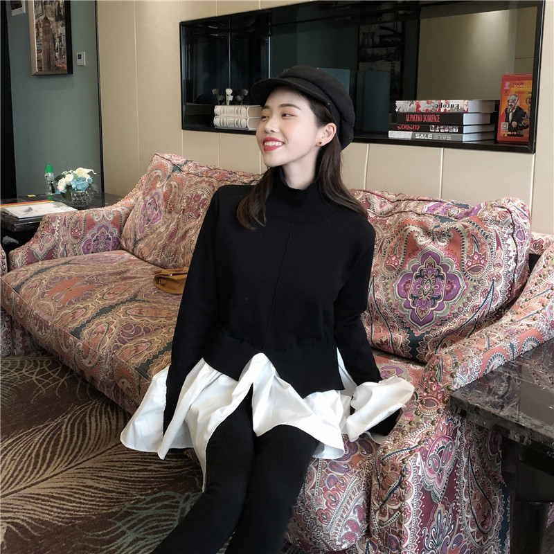 秋季新款韓版設計感假兩件拼色半高領不規則喇叭袖襯衫針織衫上衣