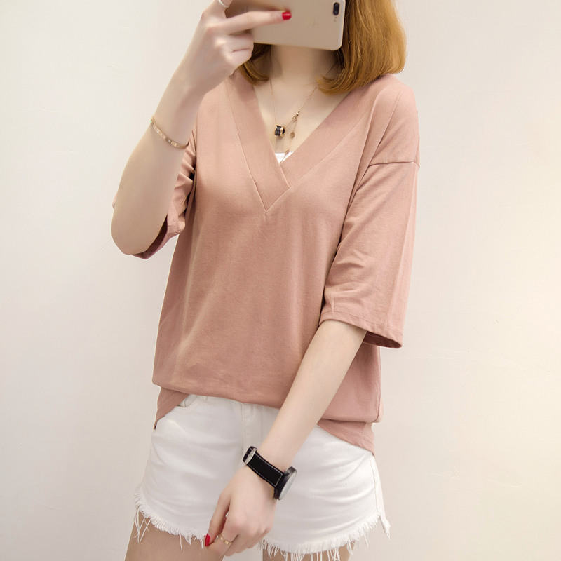 短袖t恤女寬松上衣女夏裝新款女裝白色韓版V領體恤衫打底百搭