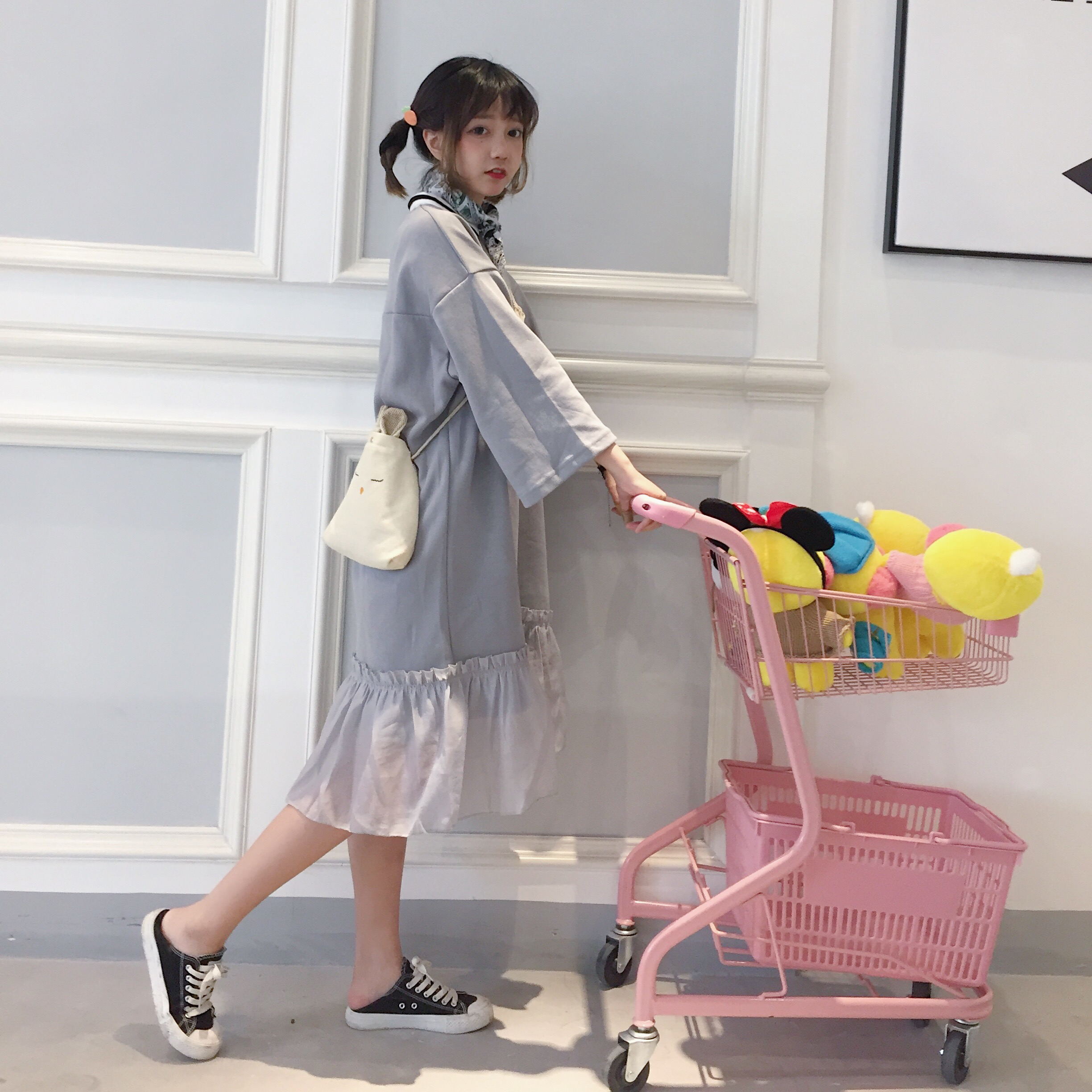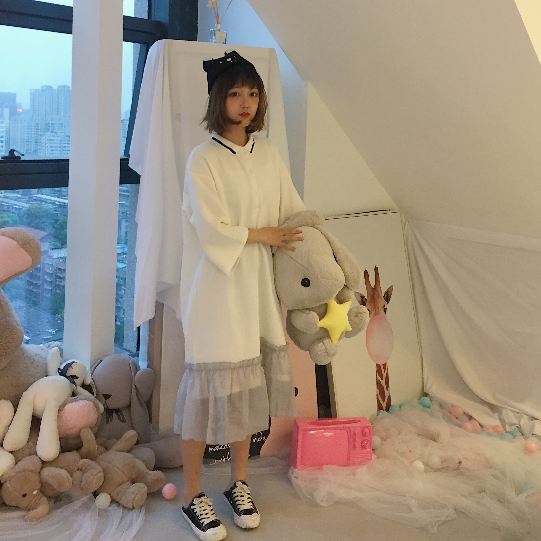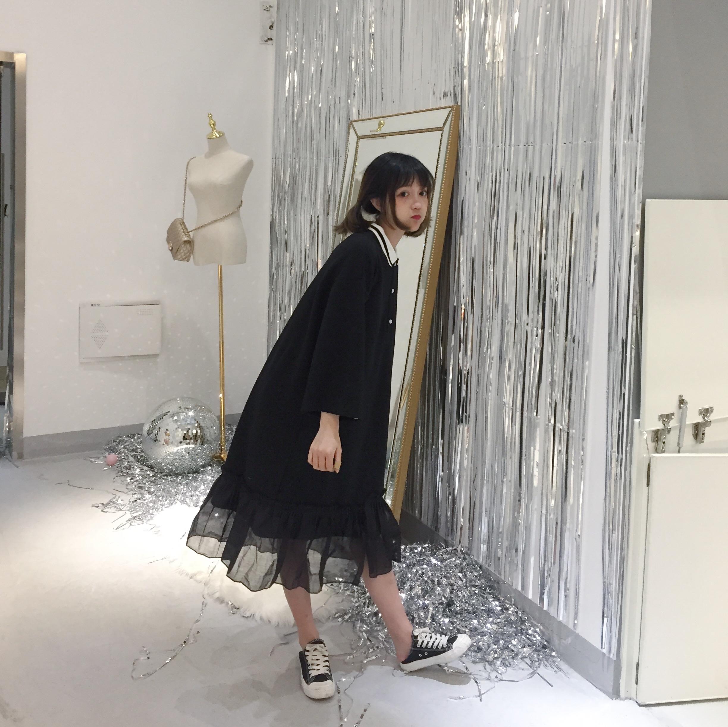 / 夏季新款女裝學院風條紋領寬松顯瘦雪紡裙擺拼接荷葉邊學生連衣裙