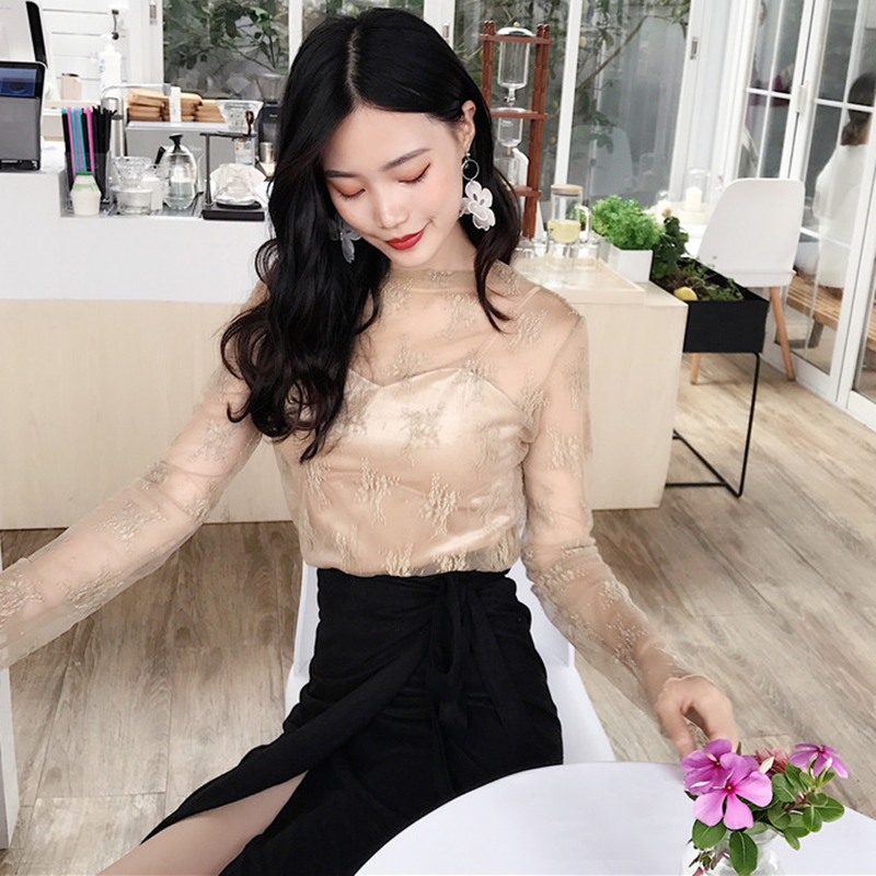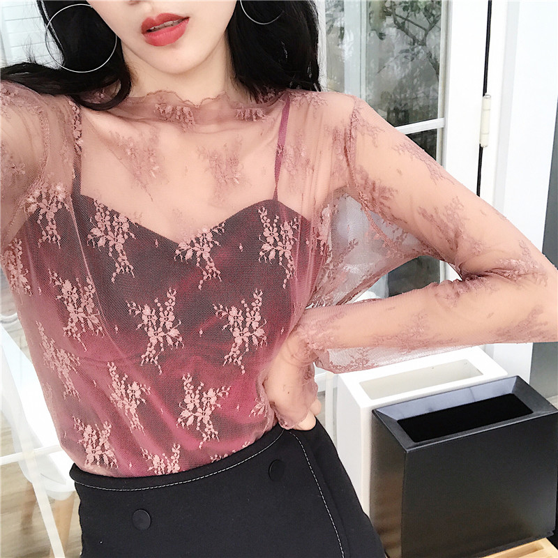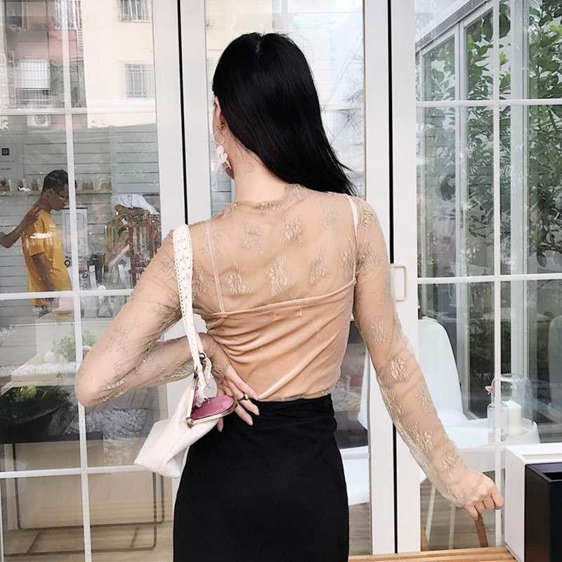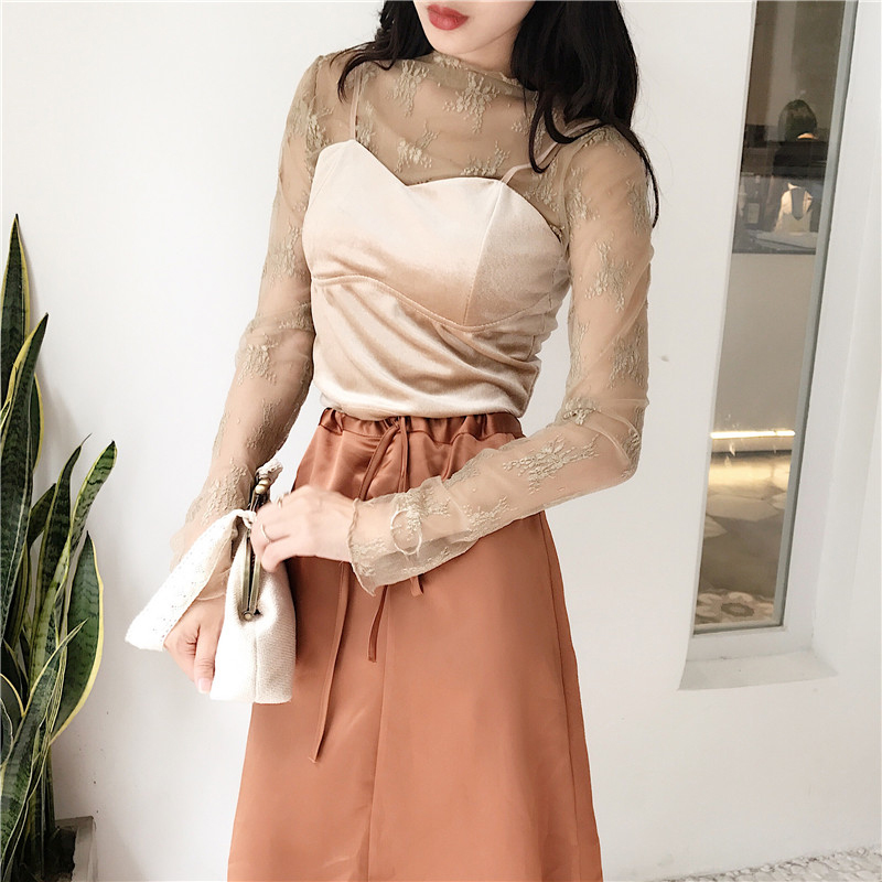 / 秋冬裝女2018新款韓版chic長袖透視上衣絲絨性感V領小吊帶兩件套