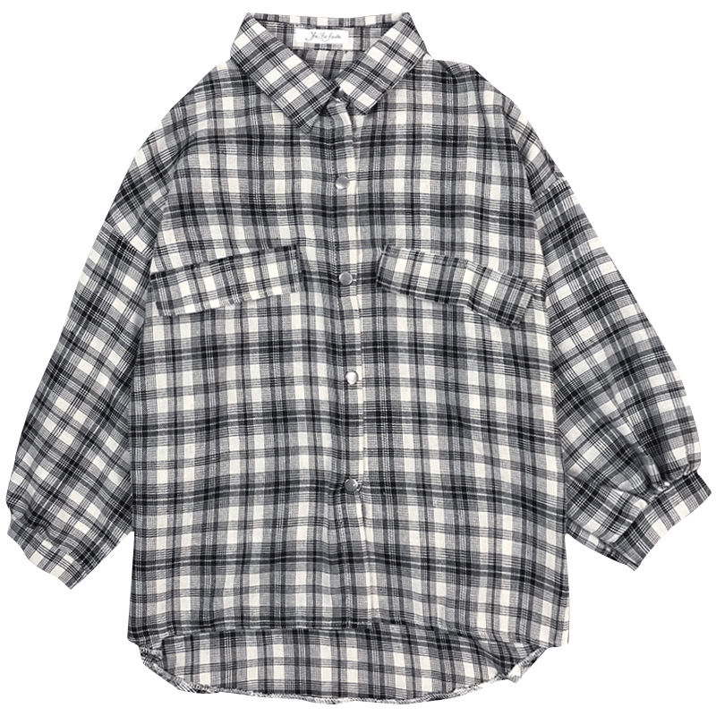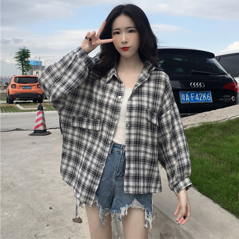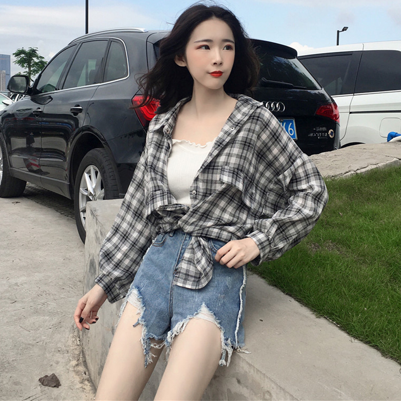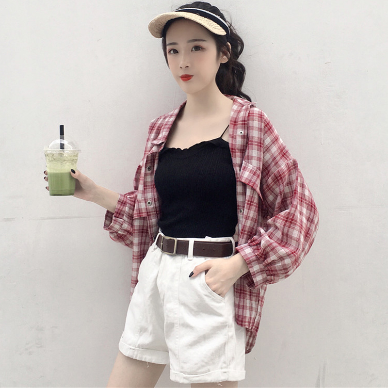 / 秋裝女裝新款韓版寬松燈籠袖防曬開衫學生薄款復古格子襯衣蝙蝠衫