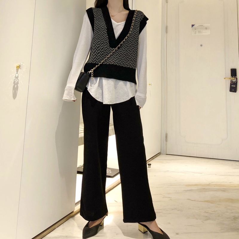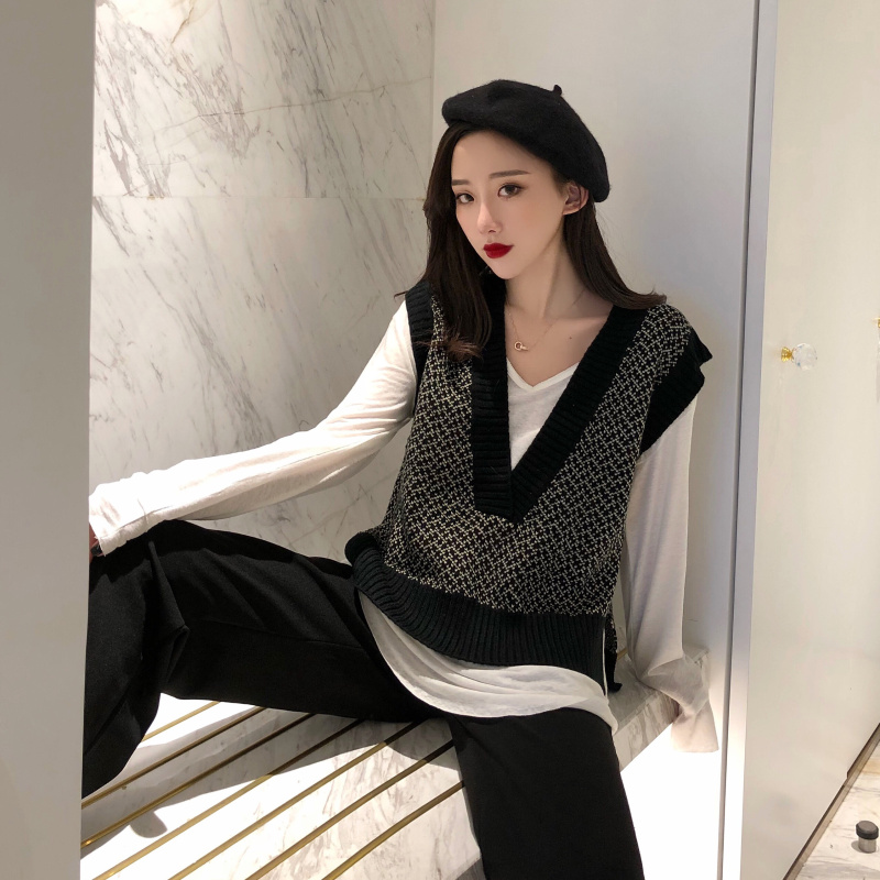 新款V領寬松毛線針織馬甲背心棉質打底衫長袖上衣女T恤時尚套裝潮
