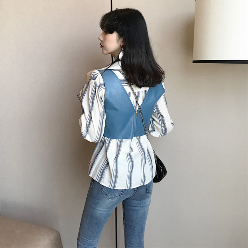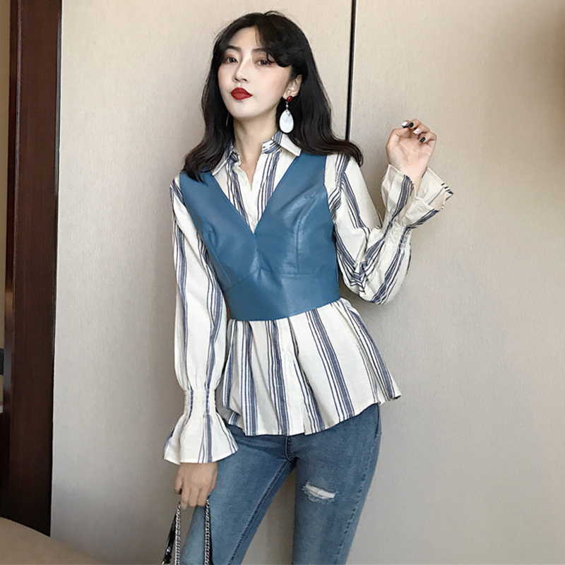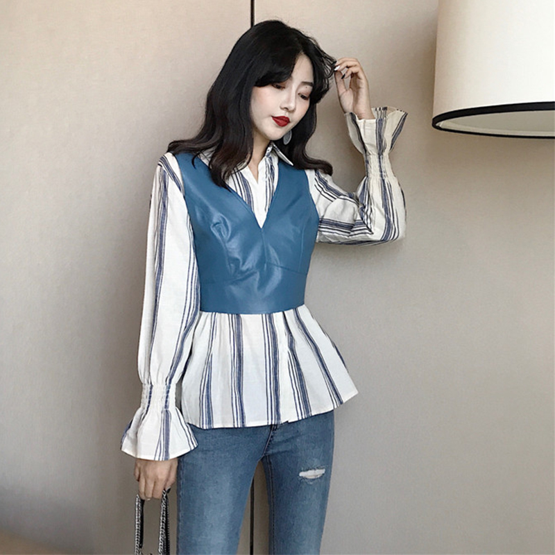 / 洋氣套裝女2018秋冬新款氣質喇叭長袖條紋襯衣時尚V領短款皮馬甲