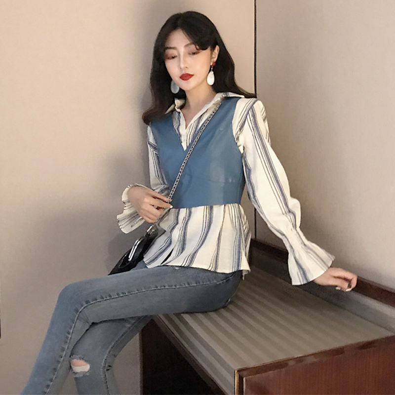 洋氣套裝女2018秋冬新款氣質喇叭長袖條紋襯衣時尚V領短款皮馬甲