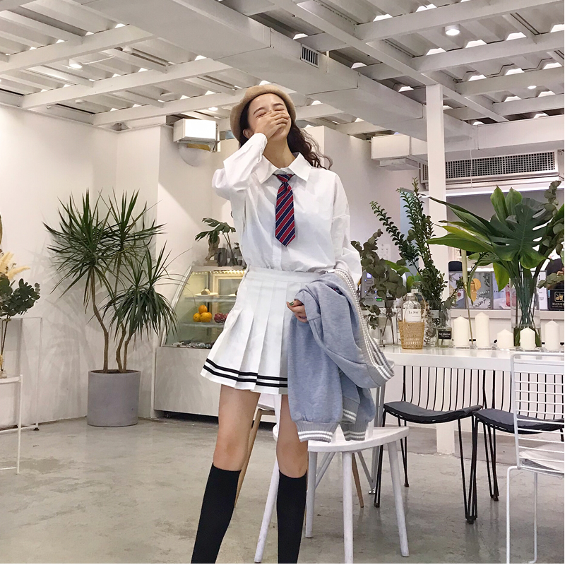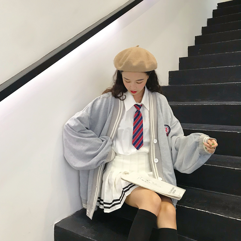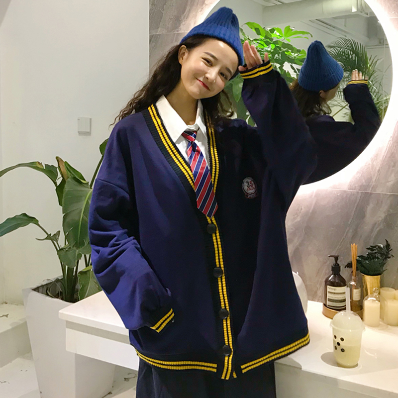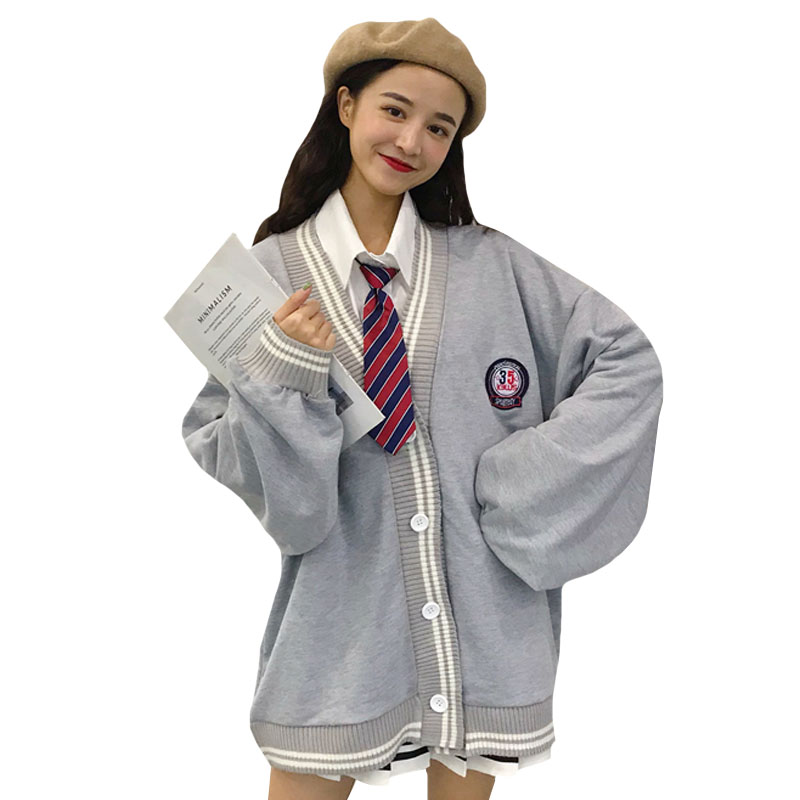 / 韓版時尚休閑套裝秋季中長款V領衛衣開衫外套+襯衣帶領帶兩件套女