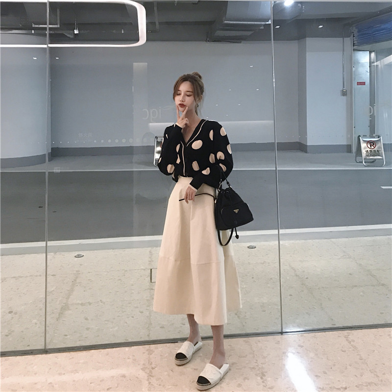 韓國ulzzang單排扣百搭波點針織開衫外套女+高腰中長半裙復古套裝