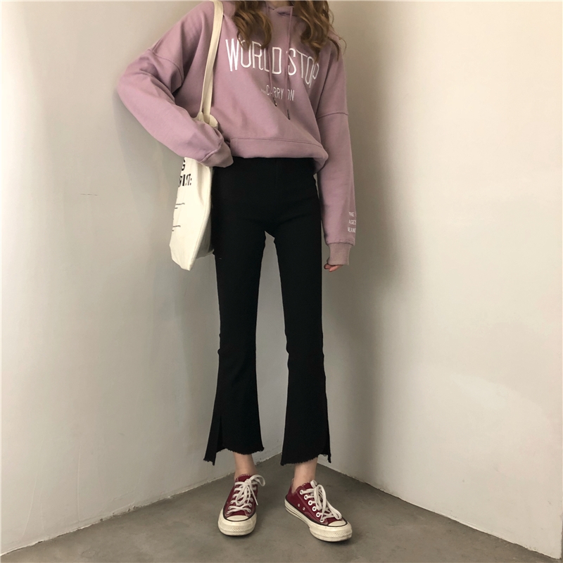 秋冬韓版彈力緊身喇叭褲高腰不規則直筒褲休閑褲九分褲學生褲子女