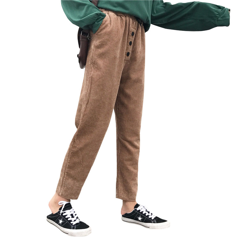 秋冬韓版松緊腰燈芯絨褲子高腰寬松哈倫褲休閑褲直筒褲長褲學生女