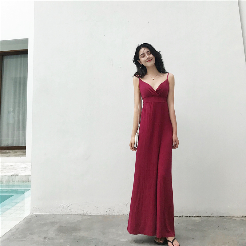 2018新款韓范港味復古晚晚同款度假風莫代爾高腰吊帶連衣裙長裙女