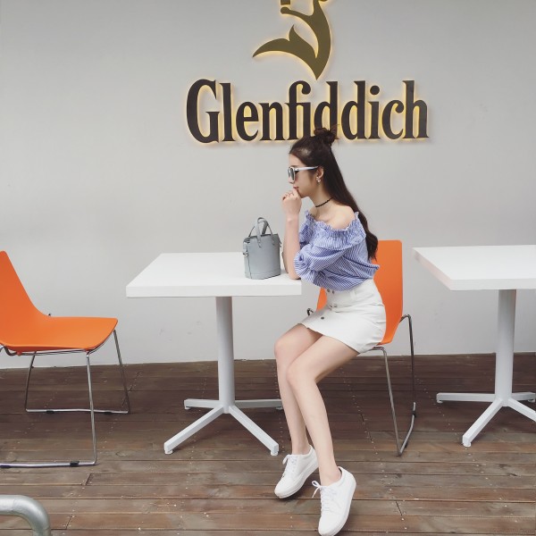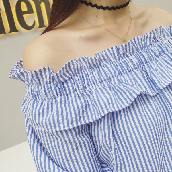 / 2017早春新款女裝清新一字領露肩條紋百搭寬松顯瘦短袖襯衫上衣女