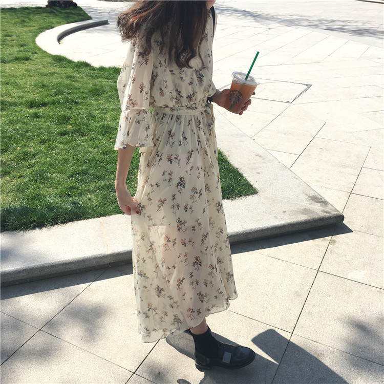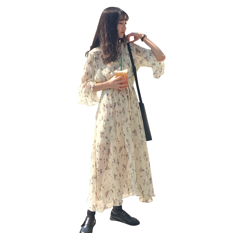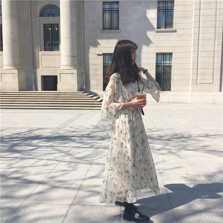 / 秋裝女裝韓版氣質小清新喇叭袖短袖碎花雪紡連衣裙a字打底裙長裙