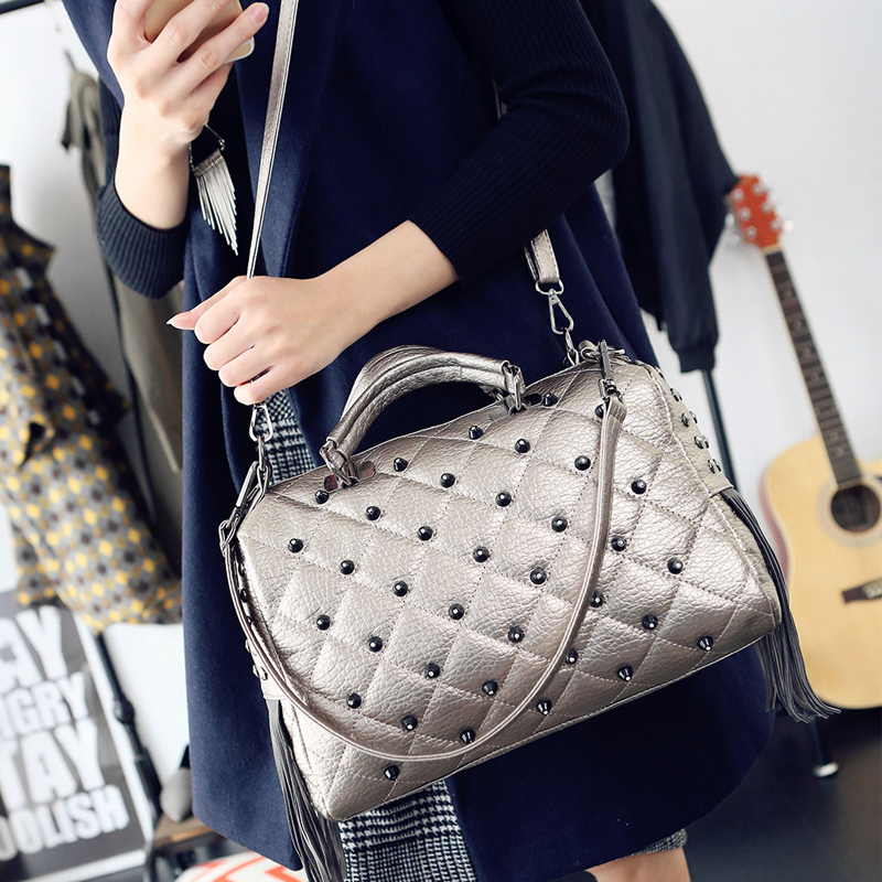 秋冬新款鉚釘鑲鉆女包波士頓包流蘇女包手提單肩斜挎包女大包