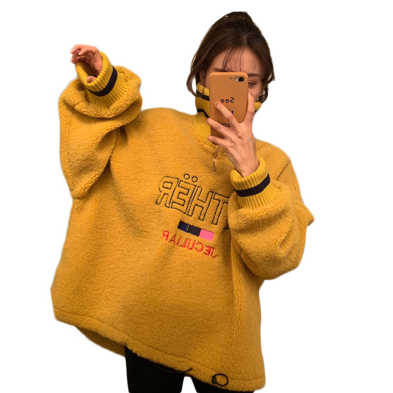 寬松顯瘦羊羔毛加厚保暖套頭衛衣女2018新款復古韓版高領字母絨衫
