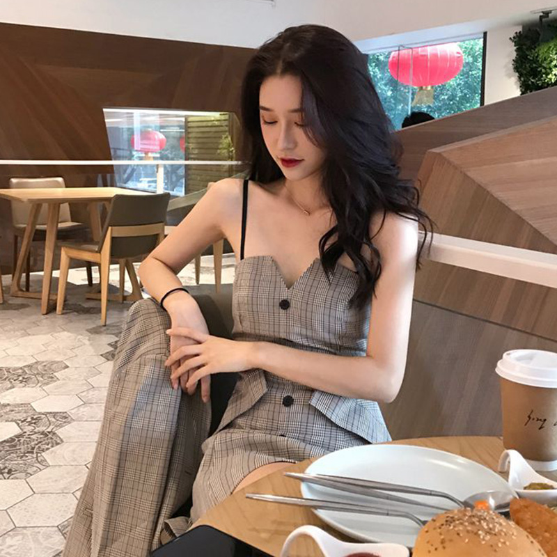 洋氣套裝秋冬兩件套2018新款港味復古格子西裝外套修身吊帶連衣裙