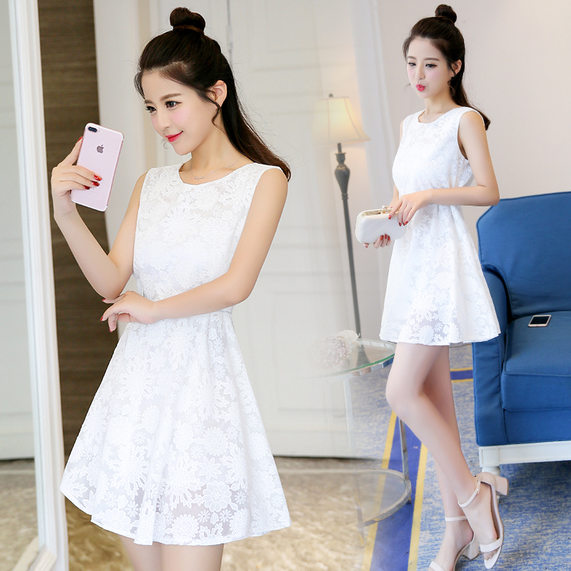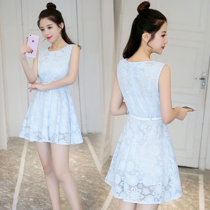 / 夏季新款韓版短袖印花蕾絲連衣裙時尚中裙a字裙修身收腰女裝