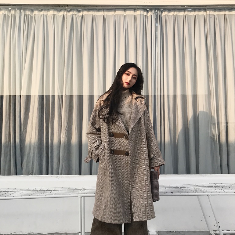 / 復古格子外套女秋裝2018新款ulzzang雙排扣寬松長款過膝呢子大衣
