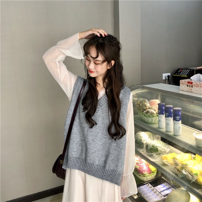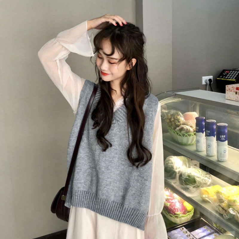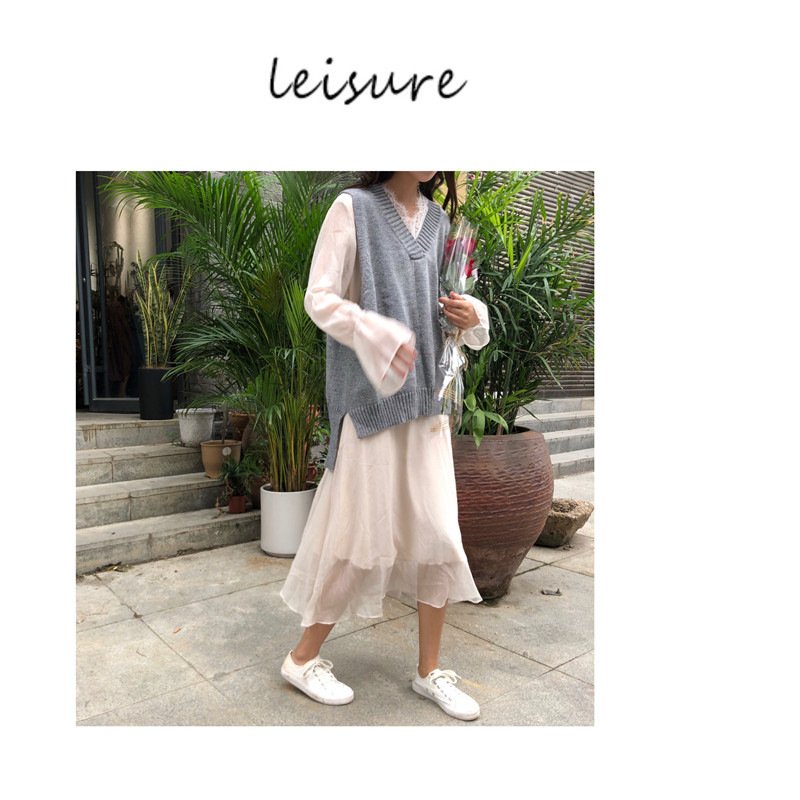 / 韓版時尚休閑套裝秋季v領毛衣馬甲背心+打底蕾絲邊連衣裙兩件套女