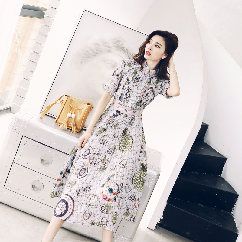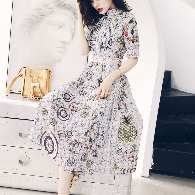 / S秀歐洲站百褶顯瘦減齡復古短袖高腰溫柔連衣裙中長款2018新款