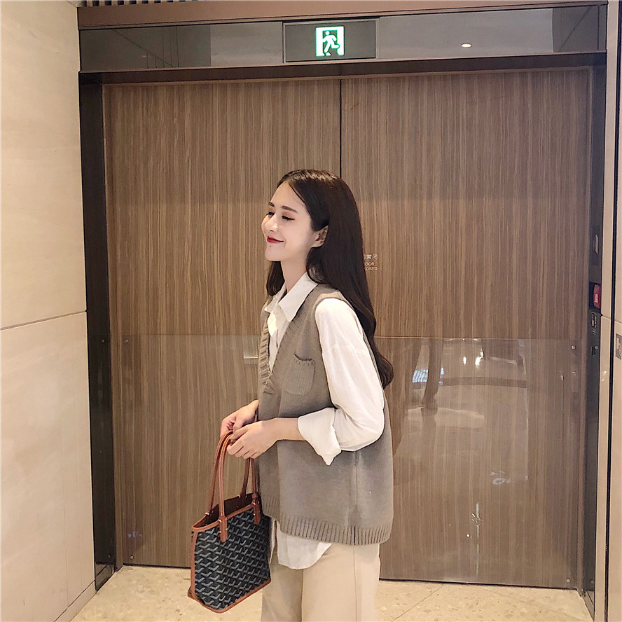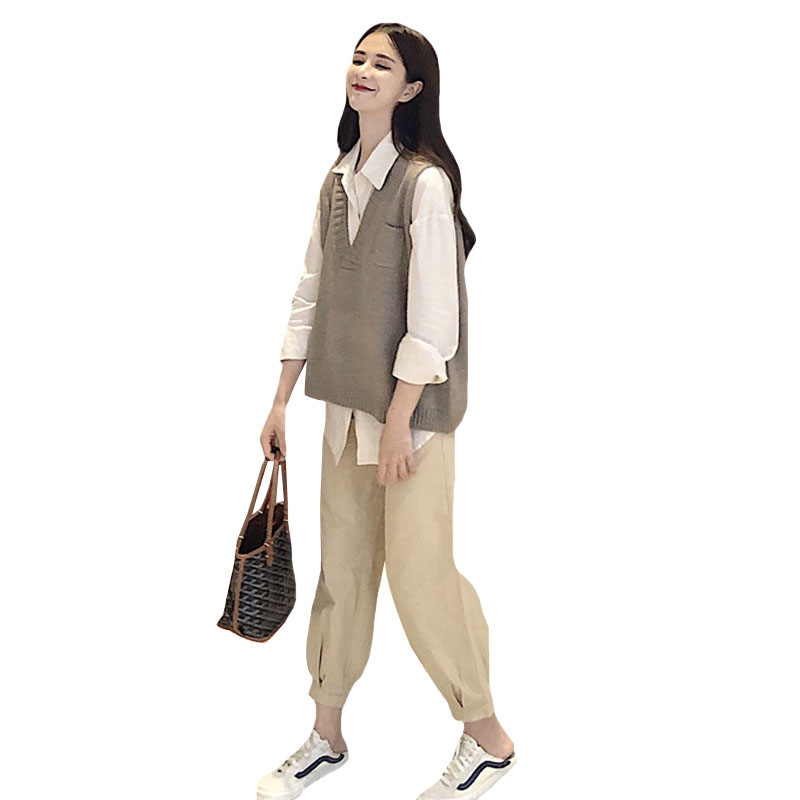 / 韓版時尚休閑套裝秋季女裝束腳燈籠褲+針織馬甲+打底衫襯衣三件套