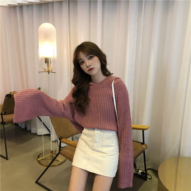 / 秋冬韓版短款蝙蝠袖寬松連帽套頭針織衫慵懶風長袖毛衣上衣外套女