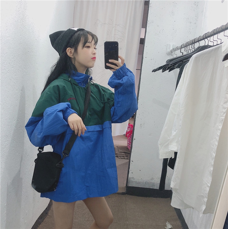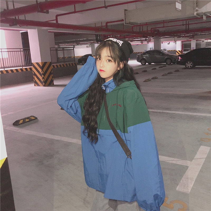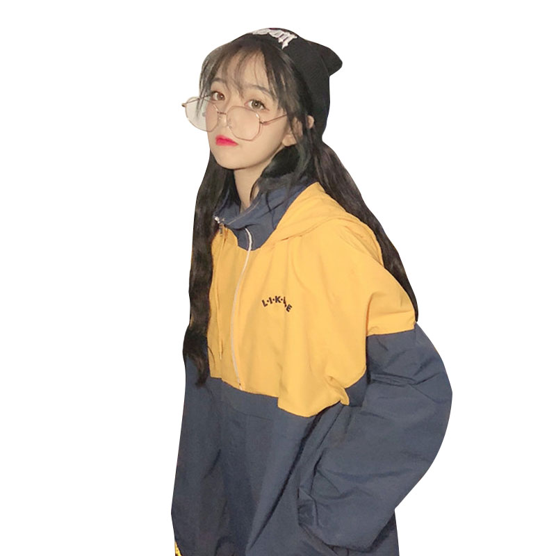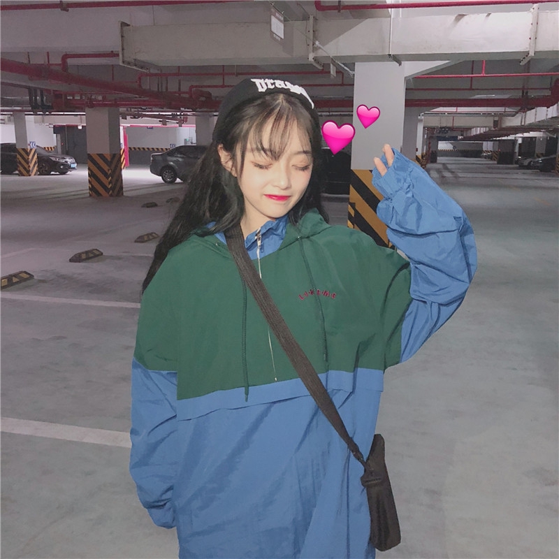 / 秋季女裝韓版中長款原宿風寬松復古港風字母刺繡撞色連帽上衣外套