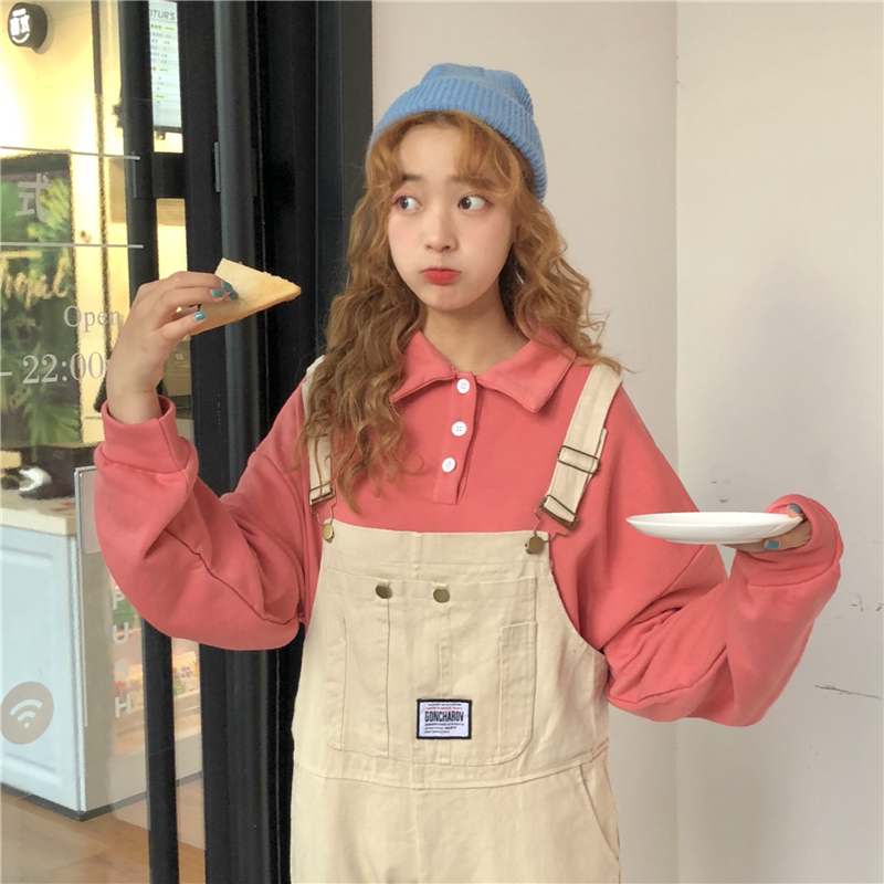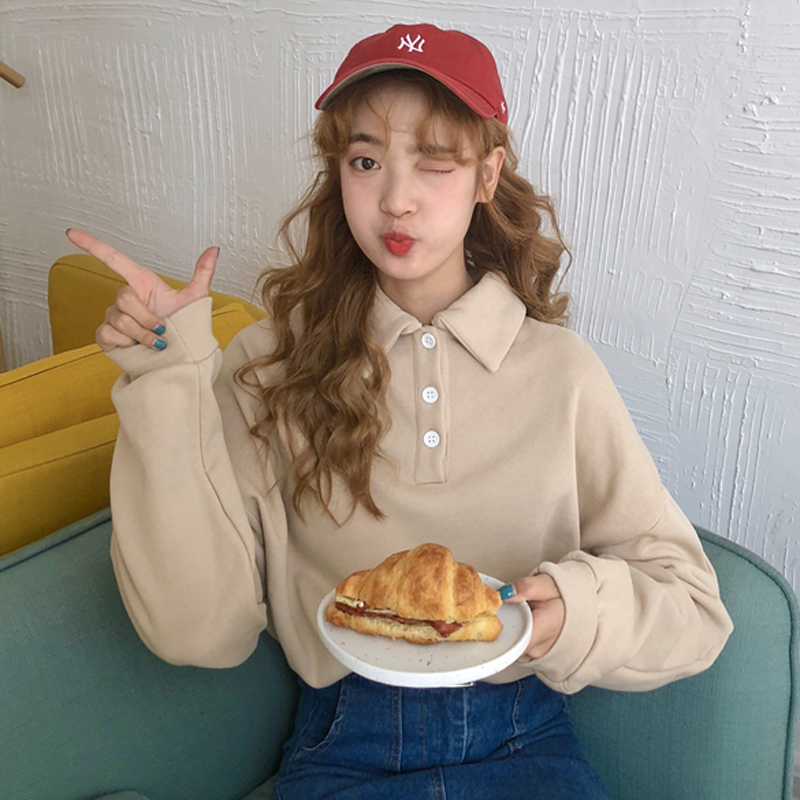 2018新款秋冬女裝韓版學院風寬松純色Polo領套頭加厚衛衣上衣外套