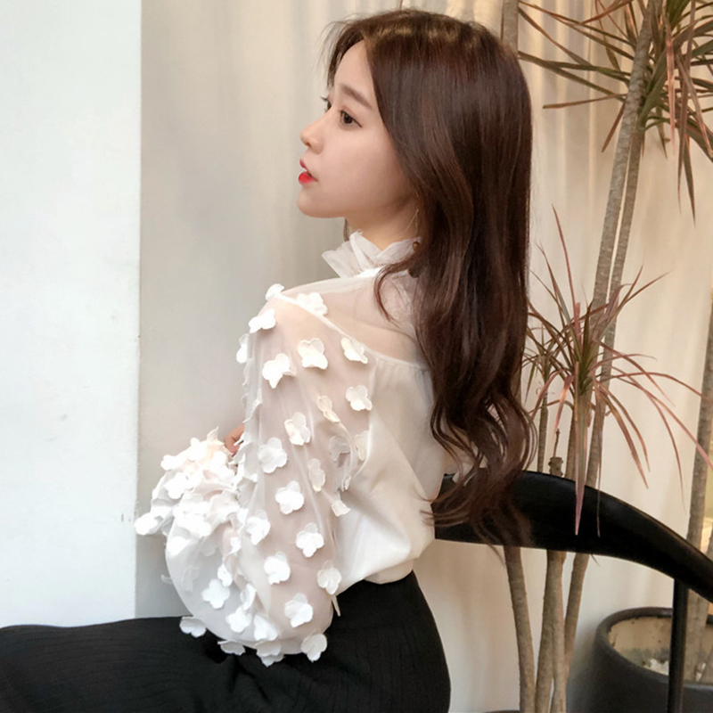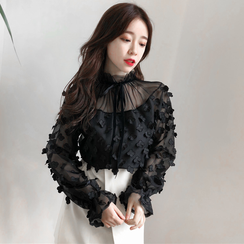 / 秋裝新款修身百搭系帶網紗打底上衣女韓版喇叭長袖花朵裝飾雪紡衫