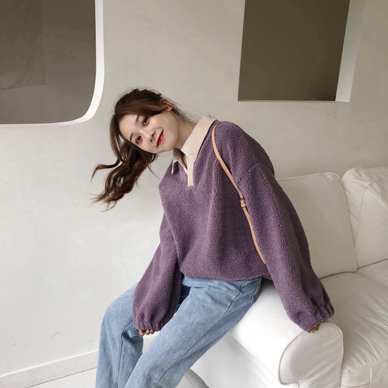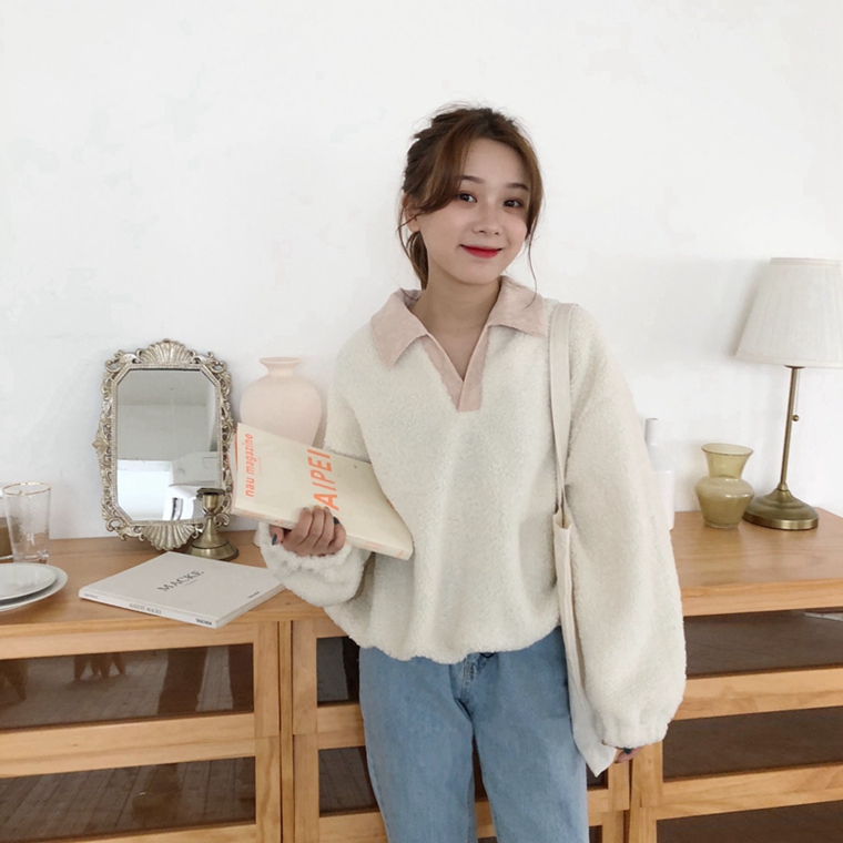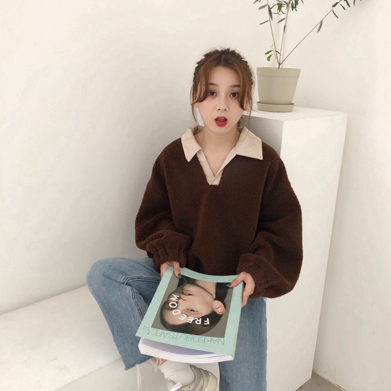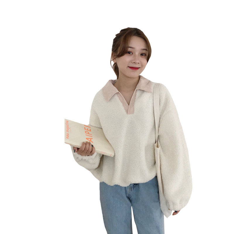 / 秋冬女裝韓版寬松仿羊羔毛V領拼接套頭pp home超火衛衣上衣外套女