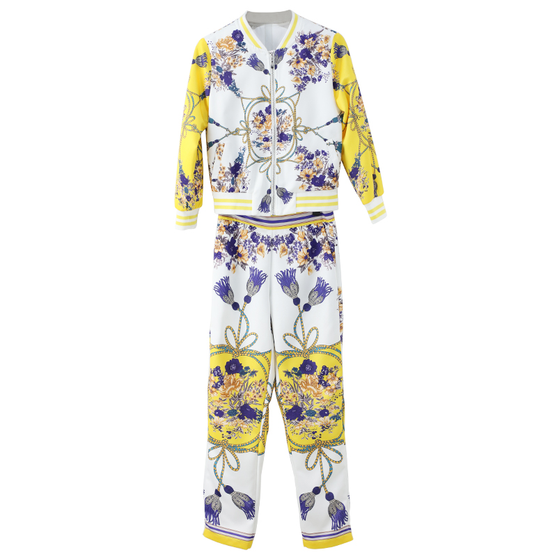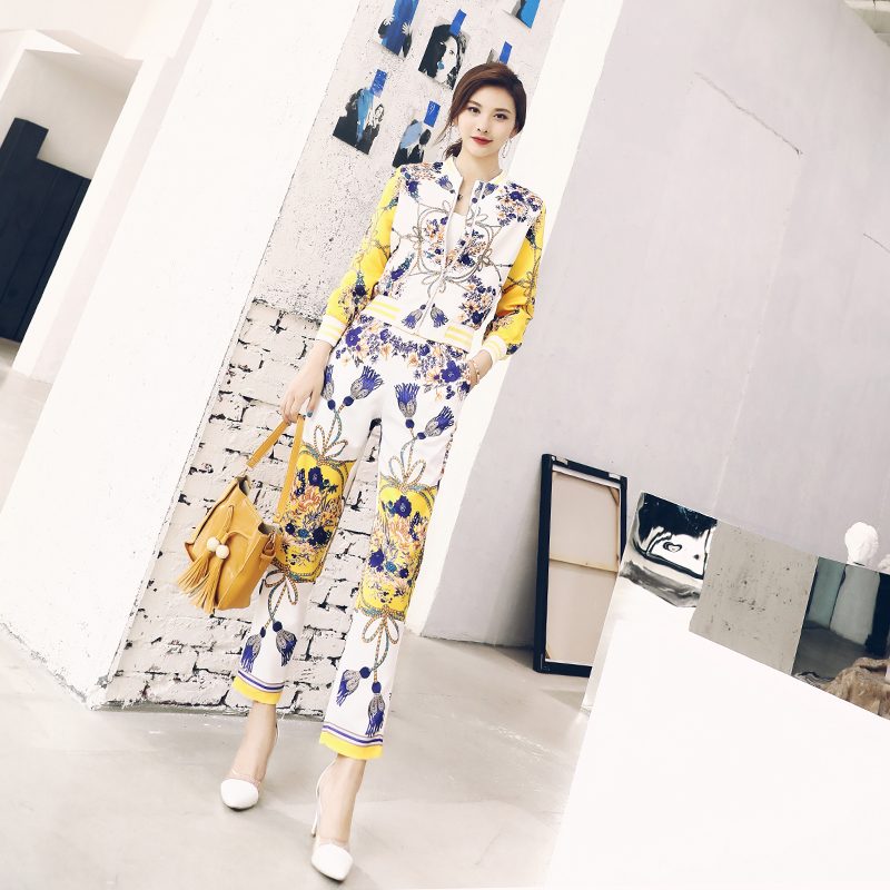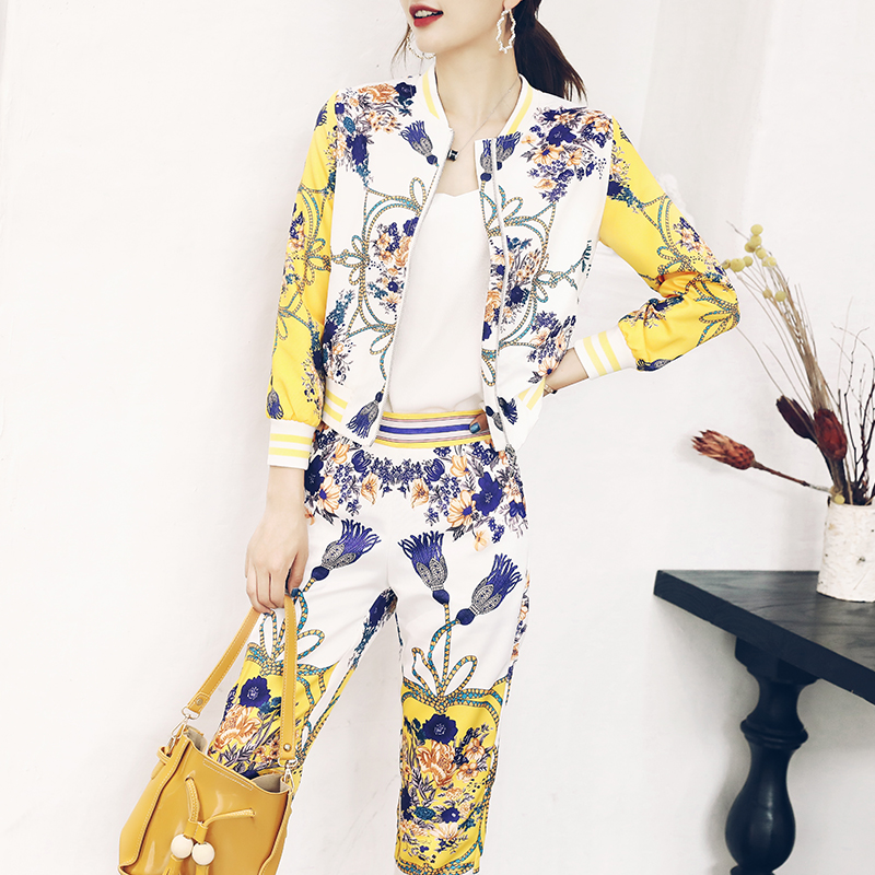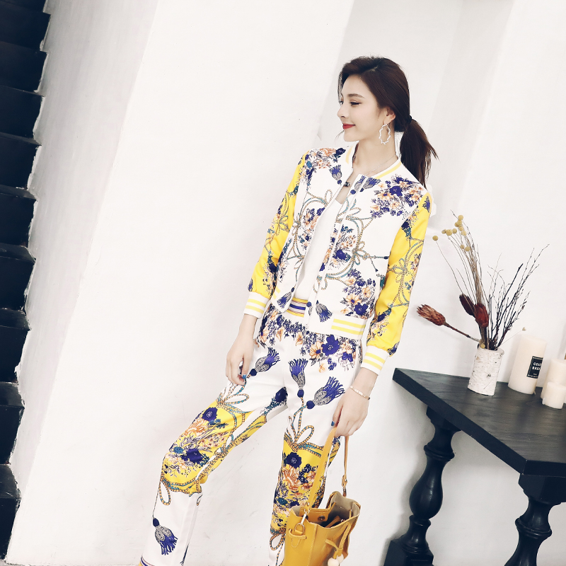 S秀名媛時尚夾克外套長褲兩件套2018秋裝新款氣質印花休閑套裝女