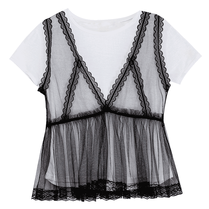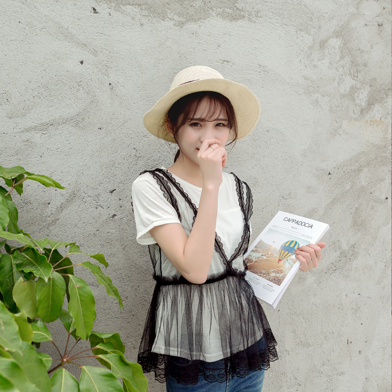 / 夏裝新款女裝韓版百搭兩件短袖t恤蕾絲吊帶打底衫圓領上衣潮