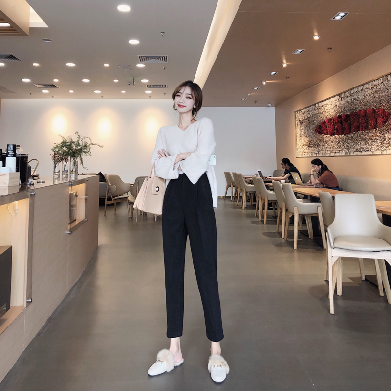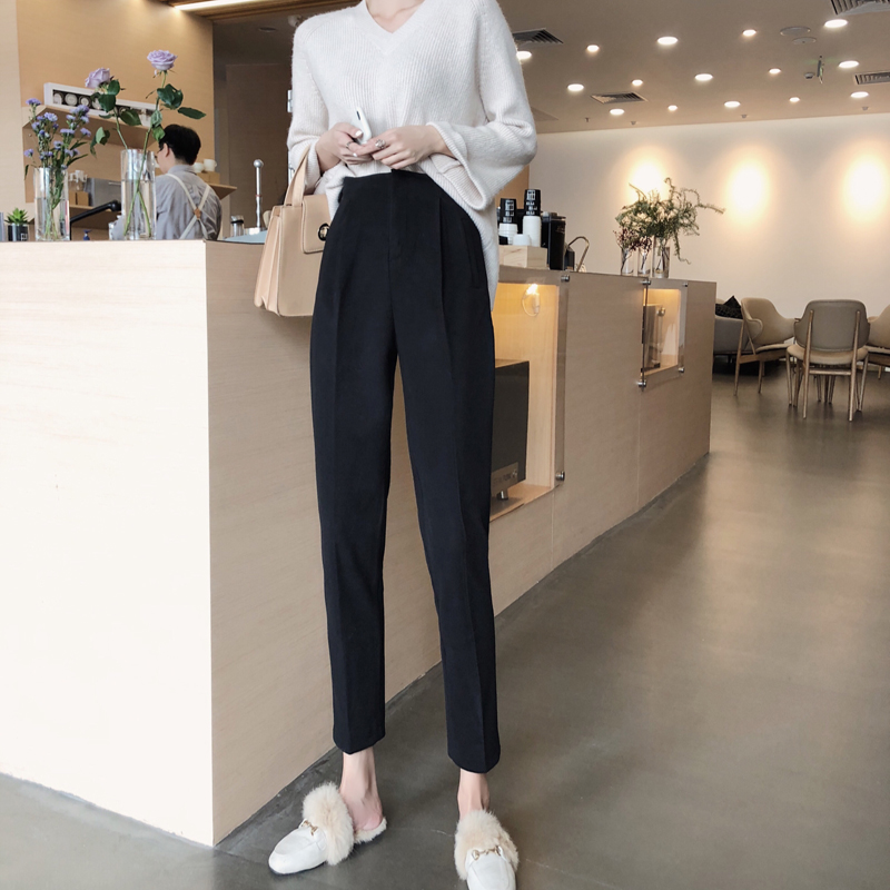 chic秋冬季毛呢哈倫褲女直筒西裝褲百搭寬松小腳蘿卜褲休閑九分褲