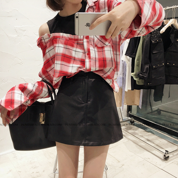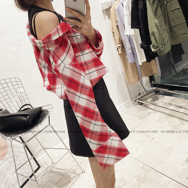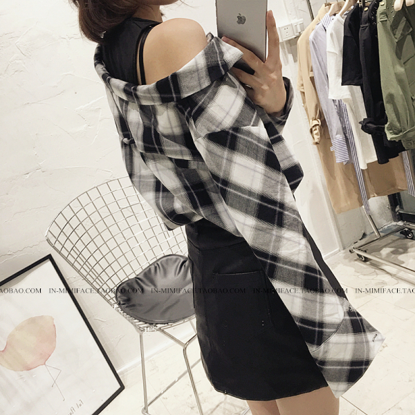 / 春裝新款韓版寬松假兩件襯衣 百搭學生不對稱拼色格子長袖襯衫女