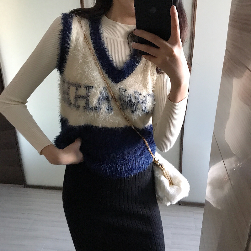 / 韓版女神套裝秋冬新款百搭毛毛針織馬甲背心女+打底衫+針織包臀裙