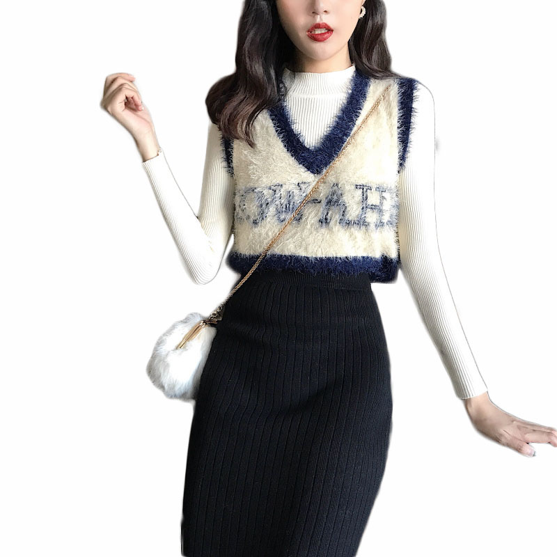 韓版女神套裝秋冬新款百搭毛毛針織馬甲背心女+打底衫+針織包臀裙